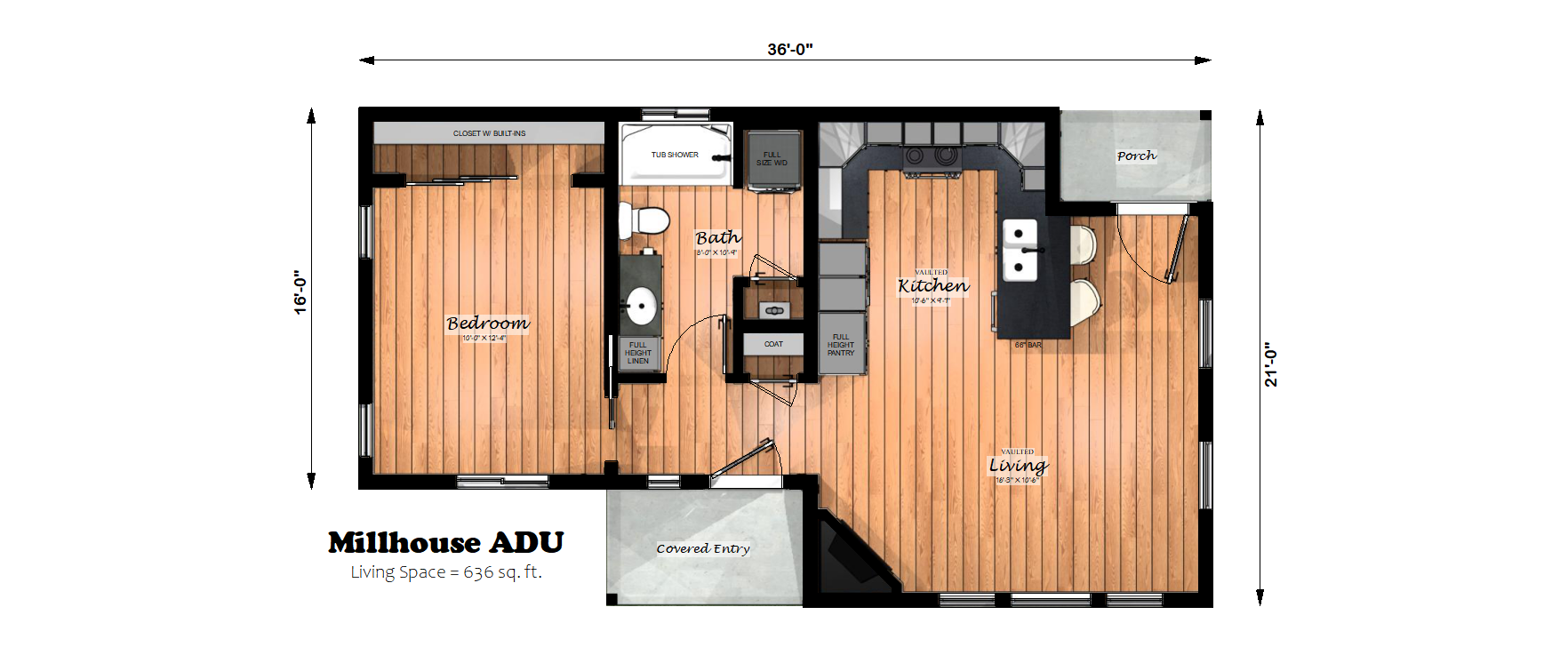 Craving a charming escape? Build your own haven with the Millhouse ADU! This 636 sq. ft. unit, constructed directly on your lot, boasts a modern open living concept and a cozy fireplace. Ideal for a guest suite, home office, or studio apartment, the Millhouse offers both comfort and functionality. Visit our website today and transform your property with the Millhouse ADU!