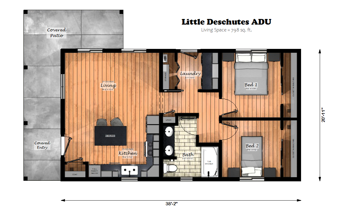 Tight on space, big on dreams? The Little Deschutes ADU by BuildADU packs a punch in just 798 sq. ft. This gem boasts 2 bedrooms, 1 bathroom, and a dedicated laundry room, making it ideal for families, guests, or rental income. Plus, a large covered patio extends your living space and creates the perfect spot to unwind.