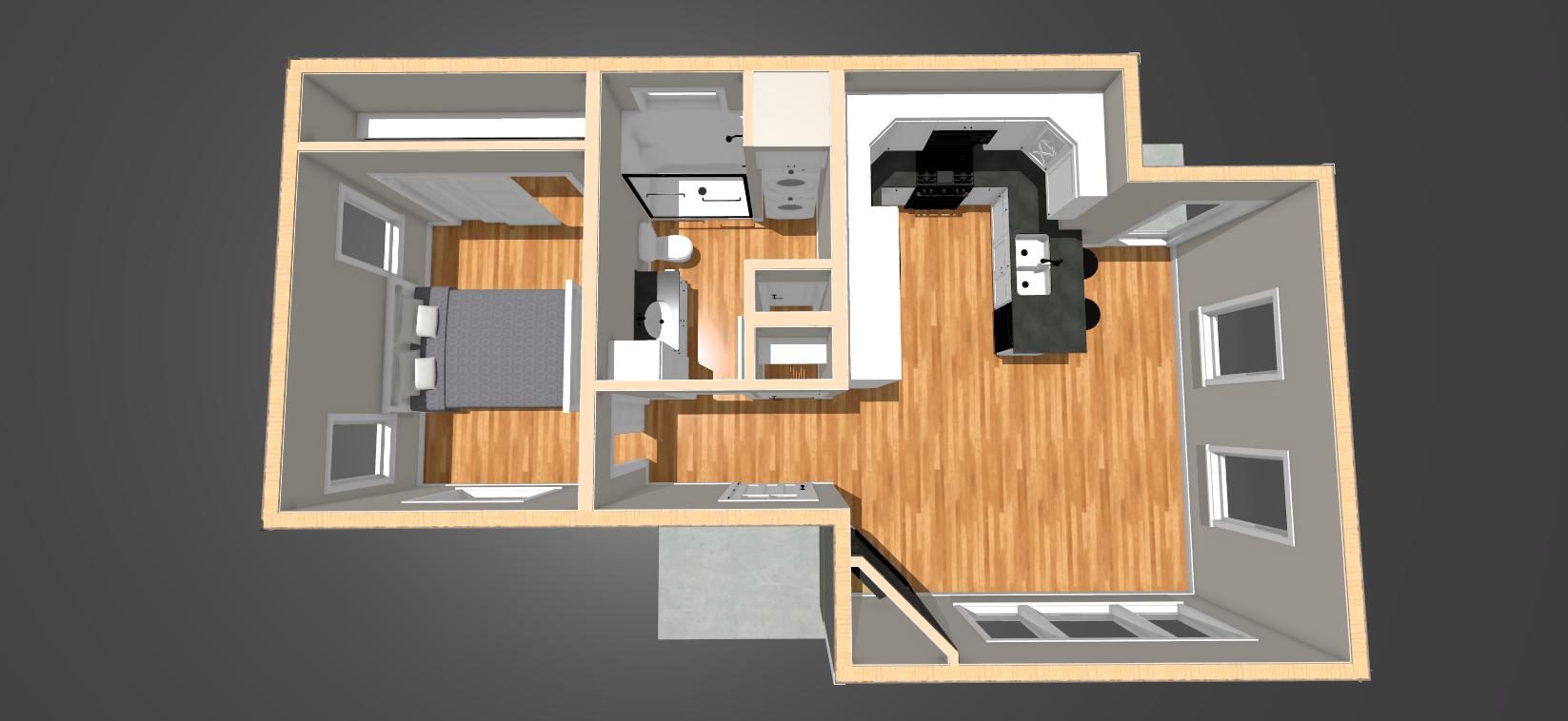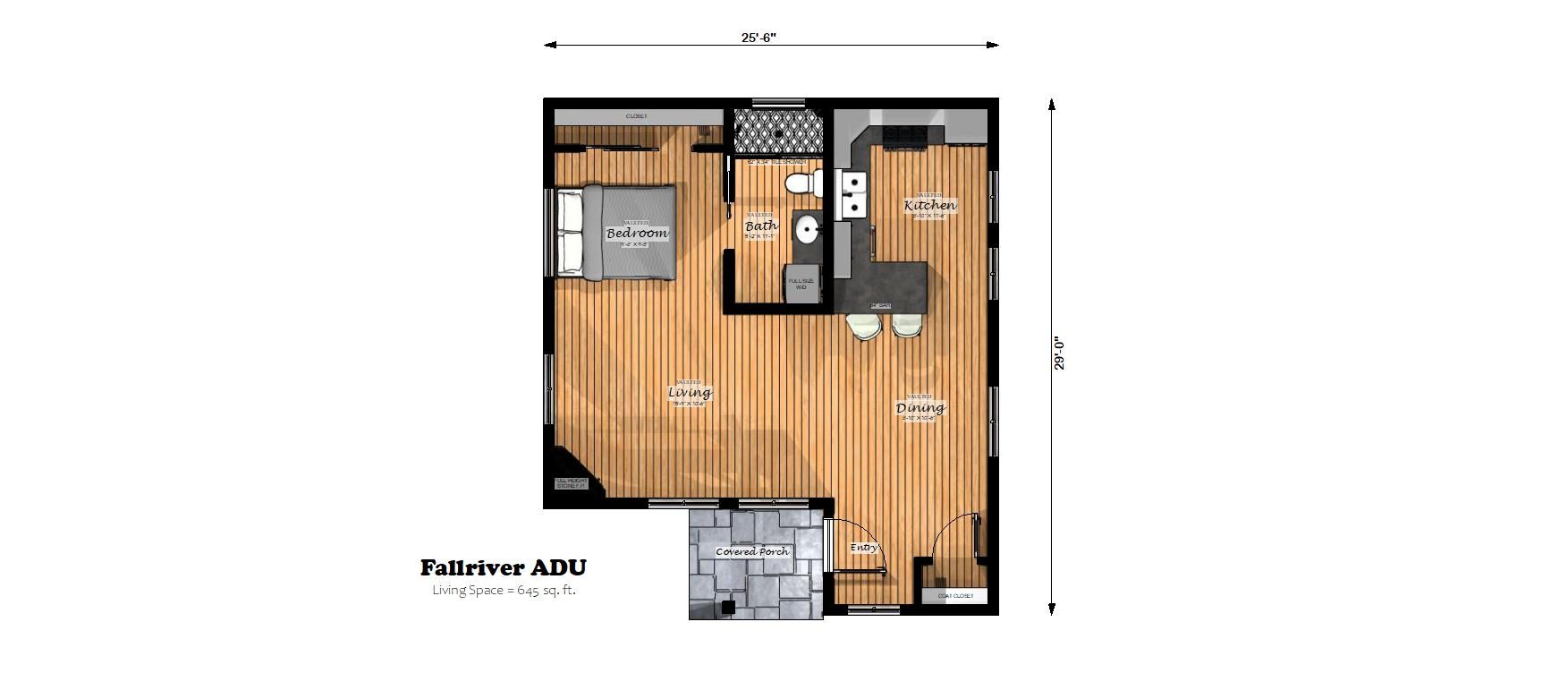 The Fall River’s studio layout is perfect for a guest suite, in-law unit, or even a home office with extra square footage. This ADU maximizes functionality while maintaining a modern aesthetic.